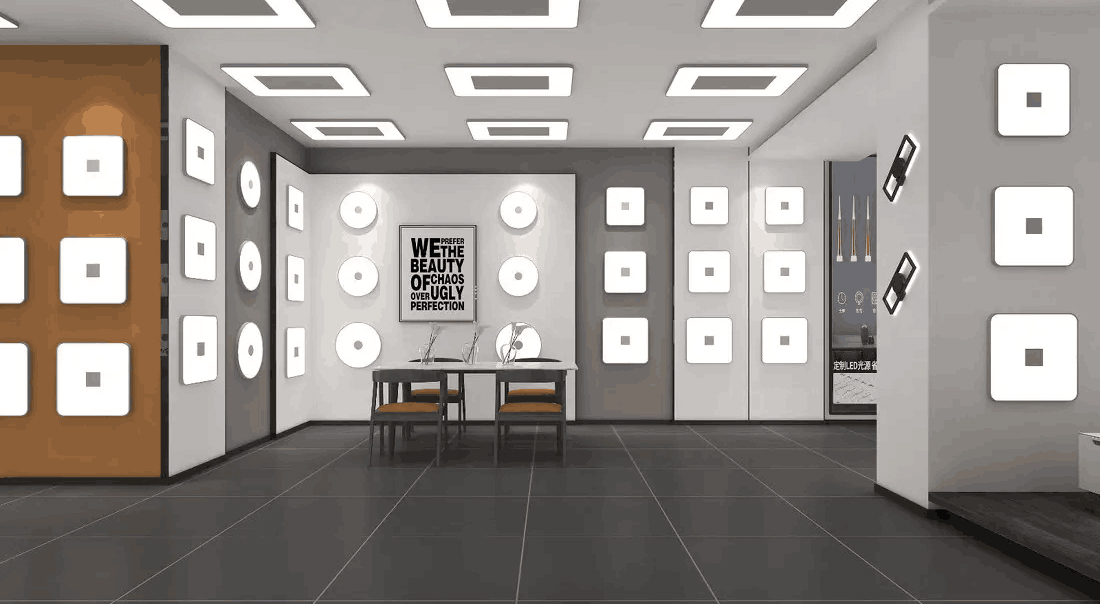 半间接照明是指60%以上的灯光先照射到墙上顶棚上,再反射到被照的物体上,少量的光线直接照射到被照物体上。半间接照明的特点是光线柔和,没有较强的阴影,顶棚明亮均匀,适用于展厅的共享空间和会议洽谈空间。