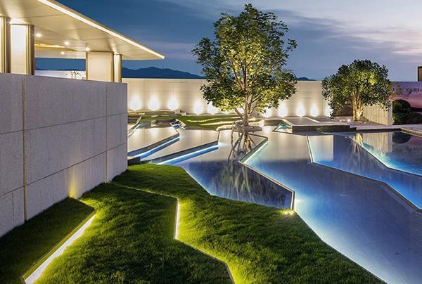 灯带材质柔软,防水性好,发光颜色多变,可用于营造明暗层次和虚实对比的视觉感,多应用于装饰照明领域,如在别墅屋檐可营造氛围,及丰富建筑轮廓;泳池或是水池边,通过灯光与水面交相呼应,多种颜色不断变幻,营造出动态的朦胧感等。