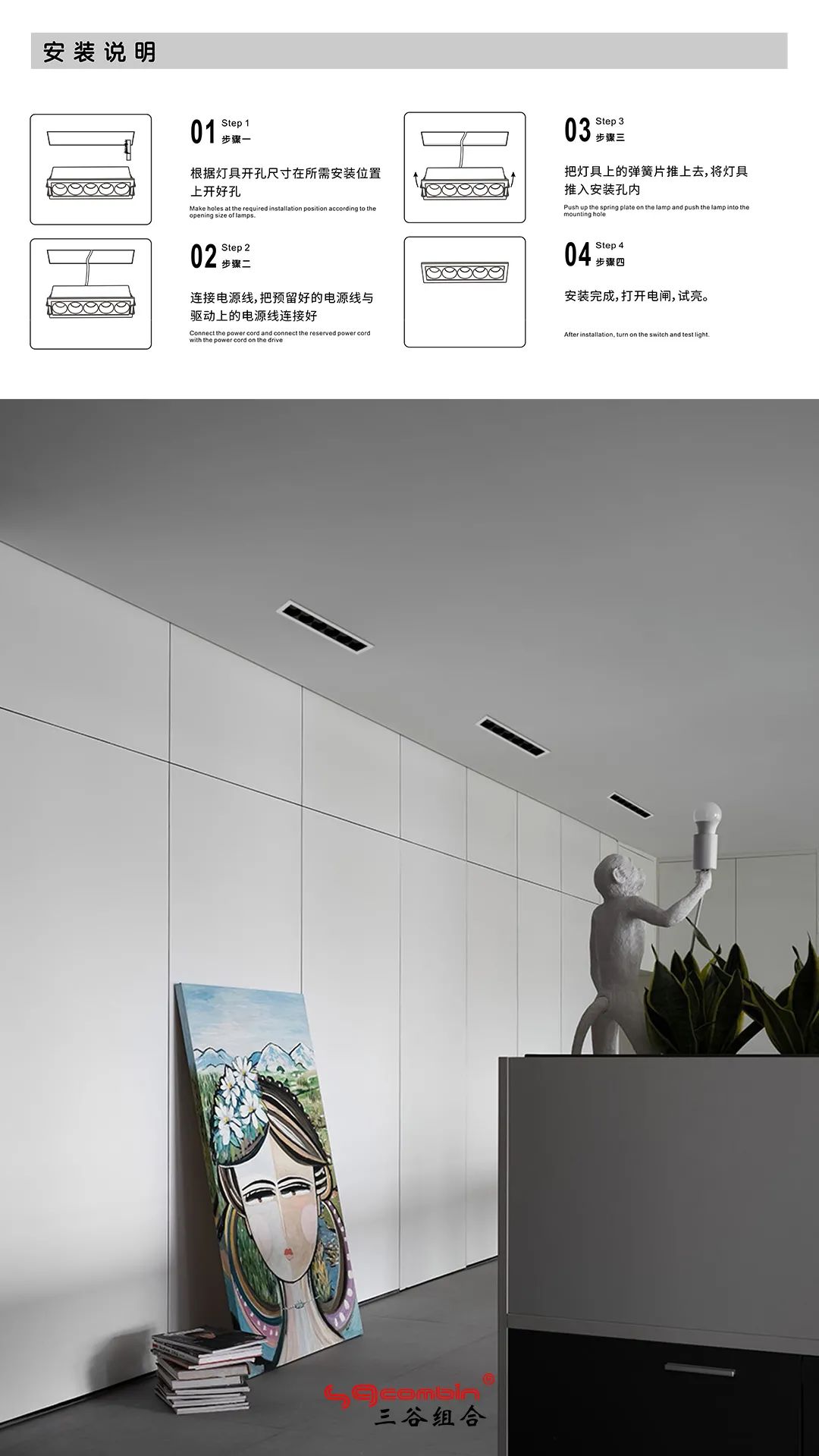 步骤2:连接电源线,把预留好的电源线与驱动上的电源线连接好;步骤3:把灯具上的弹簧片推上去,将灯具推入安装孔内;