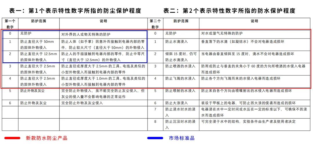 IP(INGRESS PROTECTION)防护等级系统是由IEC(INTERNATIONAL ELECTRONICAL COMMISSION)所起草,将电器依其防尘防湿气之特性加以分级。IP防护等级是由两个数字所组成,第1个数字表示电器防尘、防止外物侵入的等级(这里所指的外物含工具,人的手指等均不可接触到电器内之带电部分,以免触电),第2个数字表示电器防湿气、防水侵入的密闭程度,数字越大表示其防护等级越高。简单来说就是将产品的防尘和防水性能进行了等级划分。防护等级多以IP后跟随两个数字来表述,数字用来明确防护的等级。第一位数字表明设备抗微尘的范围,或者是人们在密封环境中免受危害的程度。代表防止固体异物进入的等级,最高级别是6;第二位数字表明设备防水的程度。代表防止进水的等级,最高级别是8。